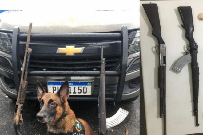 Com auxílio de cão farejador, PM encontra fuzil e espingarda