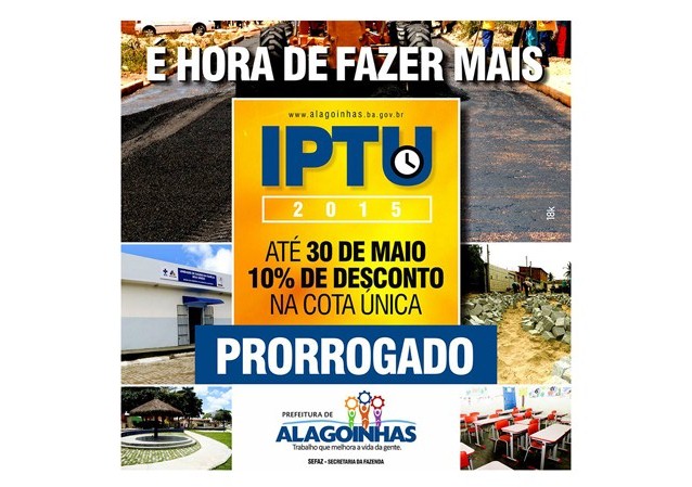 A Prefeitura de Alagoinhas, por meio da Secretaria da Fazenda (SEFAZ) informa que o IPTU para parcelamento permanece com as seguintes datas (10/06, 10/07, 10/08, 10/09 e 10/10). O TFF parcelado, 2ª parcela (10 de junho), 3ª (10 de julho) e a 4ª (10 de agosto). O ISS segue com parcelas no dia 10 de cada mês (junho, julho, agosto, setembro, outubro, novembro e dezembro).