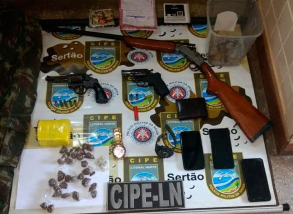 Com eles foram apreendidos uma espingarda calibre 20, dois revólveres calibre 38, munições, um tablete de maconha prensada de aproximadamente 1 kg, 28 trouxas da mesma erva, três cadernetas, e um carro modelo Voyage, placa OKM-9454.