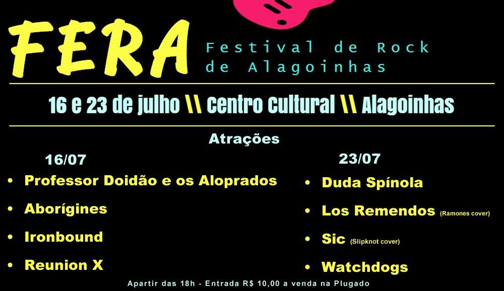 No sábado (16), a partir das 18 horas, acontece no Centro de Cultura o Festival de Rock de Alagoinhas (FERA) com quatro atrações. Na semana seguinte, no dia 23, outras quatro atrações realizarão apresentações para os amantes do rock e os não iniciados.