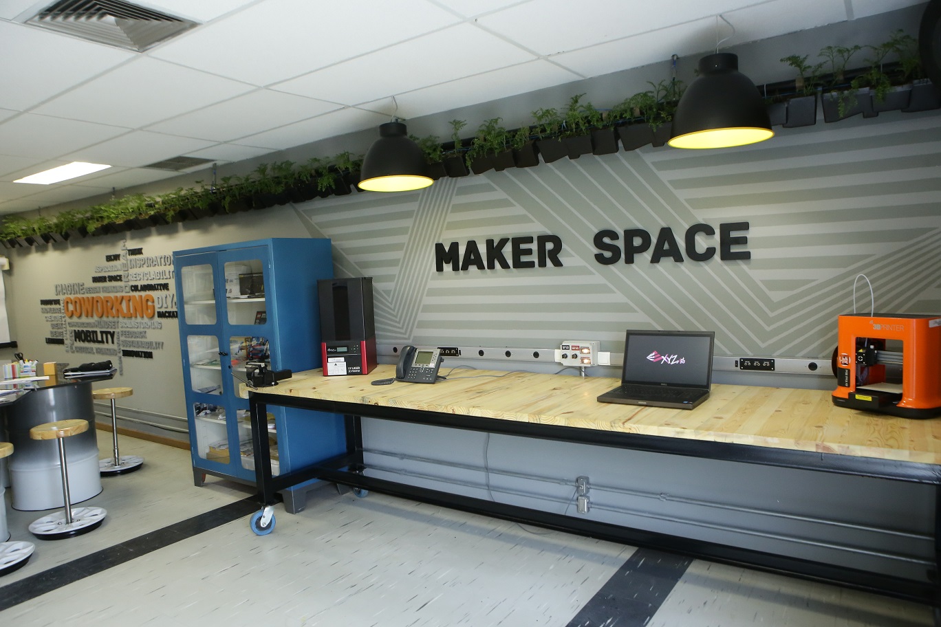 Recém-inaugurado, o Creative Room conta com dois ambientes: o de coworking e o makerspace – espaço comunitário equipado com ferramentas de uso compartilhado para a criação de projetos, conceitos e trabalhos manufaturados. O lugar oferece duas impressoras 3D, sistema de áudio e vídeo, mesas modulares para reuniões, bancada com materiais para viabilizar a construção de protótipos – como caneta 3D, scanner 3D, kits modeladores de argila, lego robótico e kits de microcontroladores – que auxiliam na construção de objetos físicos no mundo virtual.