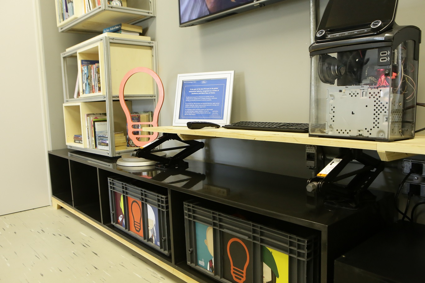 O designer Thiago Pinto colaborou para a criação do ambiente com materiais reaproveitados para a produção dos móveis e equipamentos. Foram usados 150 quilos de madeira de páletes em bancadas de trabalho, assentos das banquetas, rack e estante de livros; 200 quilos de ferro nas estruturas das bancadas, banquetas e jardim horizontal; rodas de alumínio do EcoSport FreeStyle como base das banquetas; alto-falantes do projeto do EcoSport e pneus de empilhadeira para a construção de caixas de som, entre outros recursos.