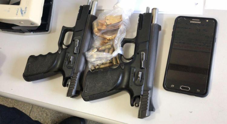 Os policiais apreenderam com eles as duas pistolas – que possuem calibre 9 mm e são de uso restrito das Forças Armadas e da Polícia Federal –, além de carregadores, munições e celulares.