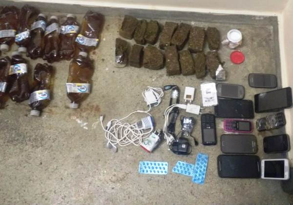 Dentro dos sacos também foram encontradas 13 garrafas de bebidas alcoólicas, uma porção de cocaína, comprimidos e carregadores de aparelhos celulares.