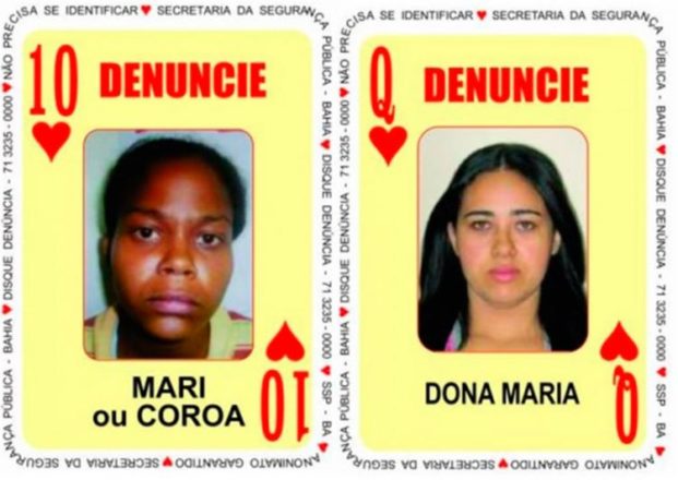 Duas mulheres procuradas pela polícia por tráfico de drogas e envolvimento em organizações criminosas após assumirem o papel dos maridos. Marisângela Soares de Sousa, 36 anos, a ‘Mari’, e Jaisane Silva Teixeira, conhecida como ‘Dona Maria’, fazem parte do Baralho do Crime, recurso utilizado pela da Secretaria da Segurança Pública (SSP) para ajudar nas buscas pelos bandidos considerados mais perigosos do estado.