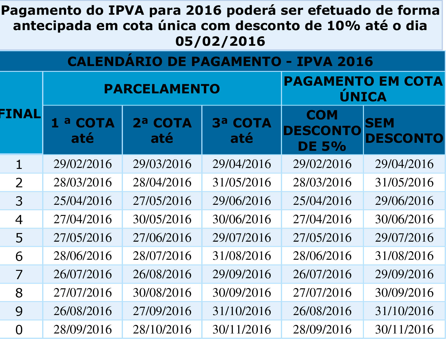 Além do desconto de 10% no IPVA para pagamento em cota única até 5 de fevereiro de 2016, existe ainda a opção de quitação com 5% de abatimento, em prazos de pagamento que variam de acordo com o número final da placa do veículo. Para isso, é só pagar o valor integral do imposto no dia do vencimento da primeira cota da placa respectiva. Os proprietários de veículos podem optar também por parcelar o IPVA em três vezes.